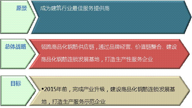 裕丰集团的战略定位是成为中国建筑行业最佳服务商,愿景是成为中国商品化钢筋服务产业的领跑者;近期战略目标是充分发挥区位优势,力争在近年建立起珠三角地区销售网络,成为该地区商品化钢筋的行业领导者。企业的中期战略目标是三年内进入资本市场,借助资本运作,促进钢筋加工配送新兴产业的发展