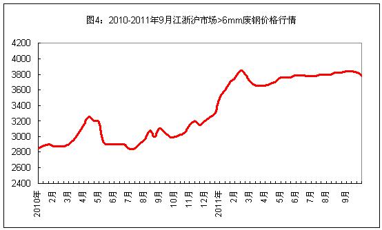 9月上中旬国内废钢市场价格波动不大,钢厂多根据自身库存情况小幅调整采购价格。进入9月下旬,受国内钢材市场价格持续下跌影响,华东、华北、东北地区部分钢厂开始陆续下调废钢采购价格。其中,江苏地区不少钢厂更是连续降价2-3次,累计降幅达60-100元/吨,这是自今年二季度以来,废钢价格首次出现较大幅度的波动。但与钢材价格下跌近300元/吨相比,废钢市场表现出了较强的抗跌性,这主要还是由于市场资源紧张所导致的。在整体库存偏紧的局面下,钢厂为了确保稳定到货,只能采取小幅度、快频率的调价。截止9月份,江浙沪地区重废(>6mm)价格为3700-3750元/吨,较8月底回落60元/吨左右。从10月份形势看,受国庆长假以及秋收季节的影响,国内资源供应紧张的局面仍将延续,部分贸易商已表示不会以低于3500元/吨的价格出货。但从比价关系看,目前二级螺纹钢与重废的价差约为800元/吨,小电炉钢厂已基本没有利润空间,部分钢厂已计划从国庆起对电炉停产检修。预计10月份国内市场废钢价格将继续小幅回落。