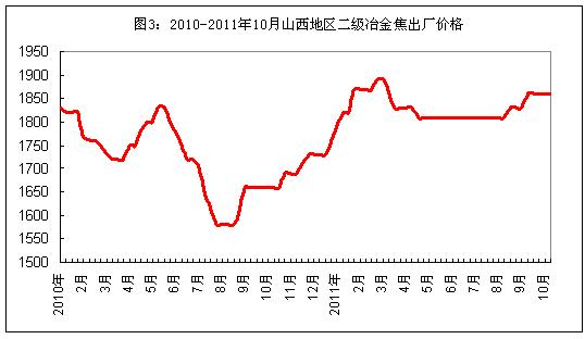 进入10月,南方市场煤价涨声一片。自10月1日起,安徽、山东地区煤炭企业(如淮矿、淄博矿业等)普遍上调了气精煤、1/3焦煤的出厂价格,幅度多在50元/吨左右。同时,贵州地区也对煤炭征收价格调价基金。此外,由于11月份起我国将炼焦煤资源税上调至8-20元/吨。煤炭价格上涨无疑对焦炭行业形成了巨大的压力。尽管本周国内焦炭价格相对稳定,但随着钢厂采购积极性减弱,以及煤炭价格的上涨,山东、山西部分焦化企业不堪重负,再度加大了限产力度。目前 ,山西地区二级冶金焦(A:13.5%)车板价格为1900元/吨左右(见图3),一级冶金焦(A:12.5%)车板价格为2000-2050元/吨;山东、河南地区二级冶金焦出厂价格为1970-2000元/吨;西南地区焦炭价格仍处于全国的高位,贵州二级冶金焦出厂价格达到2200元/吨左右。据了解,受钢材价格下跌影响,近日河北部分中小钢厂已向焦化企业发出了降价通知,幅度在30-50元/吨。预计下周国内焦炭市场将呈稳中有跌态势。
