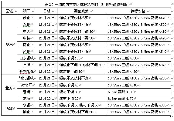 具体来看,钢坯市场:本周唐山钢坯价格小幅回落,累计跌幅为50元/吨。临近年底,国内贸易商资金状况普遍紧张,且河北本地一些调坯轧材企业仍有半数停产,整体市场成交量不大。焦炭市场:本周华北地区焦炭价格继续保持平稳。由于煤炭成本始终保持高位,目前焦化企业多处于亏损或亏损边缘,在近期部分钢厂适当加大补库力度的情况下,华东、华北地区部分焦化企业有提价意向。废钢市场:本周华东地区废钢价格保持平稳。目前国内废钢资源依然紧张,但由于钢材市场需求平淡,小电炉钢厂已没有利润空间,采购积极性明显减弱。本周江苏、福建一些小电炉钢厂已开始小幅下调采购价格,降幅在50-60元/吨,与大型钢厂采购价格基本持平。
