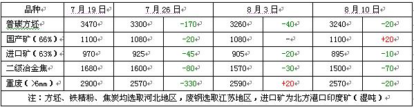 本周国内市场废钢价格小幅波动。截止本周四,江浙沪地区重废(>6mm)价格为2600-2650元/吨,边角料价格为2700元/吨左右,沙钢、南钢采购价格再降50-60元,其它钢厂相对稳定,浙江和福建个别钢厂也下调30-50元。两湖、两广地区重废价格在2750-2800元/吨,湖南部分厂家下调50元。辽宁地区重废价格为2840元/吨左右,个别厂家近期到货情况不理想,采购价格上调20元,河北地区小电炉钢厂重废不带票采购价格下调50元至2350-2400元/吨。由于近期钢厂一直限量采购,且前期价格打压过低,废钢到货量较少,目前整体库存水平较7月中旬有明显下降,少数厂家有补库意向。但考虑到目前钢材市场依旧疲软,废钢价格反弹空间和时间都较为有限。预计下周废钢价格仍将以小幅波动为主。