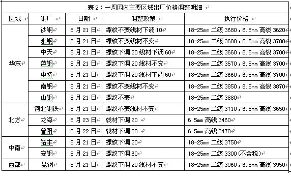 本周国内钢价再度弱势下跌,钢厂价格也以下调为主。其中沙钢8月下旬螺纹钢价格不变,线材下调10元/吨,盘螺下调30元/吨,对8月中旬螺纹钢价格补差20-30元/吨。近期钢铁行业各类问题层出不穷,钢铁企业依靠代理商订货来维持销售的模式已受到严峻挑战,钢厂销售面临着巨大压力,部分钢厂已经开始动员职工进行销售,部分钢铁企业则开始寻求与电子商务平台合作销售、对生产钢材收取加工服务费等新型模式,钢厂出厂价格调整对市场形成的直接影响也越来越弱。