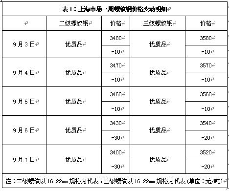 本周沪上钢价继续走低。截至9月7日,西本指数报在3530元/吨,较上周五下跌60元/吨;同期,沪上优质品二级螺纹钢代表规格报在3400元/吨,较上周五下跌90元/吨;而沪上优质品三级螺纹钢报价报在3520元/吨,较上周五下跌70元/吨。