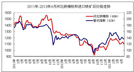 4月份国内铁矿石价格小幅波动。截止4月底,河北地区66%品位铁精粉价格保持1110元/吨左右;安徽地区65%品位铁精粉价格下跌50元至1050元/吨左右;湖北、福建地区64%品位铁精粉价格下跌20元至950-970元/吨。进口矿市场成交在4月上旬一度有所好转,普氏价格回升5.5美元/吨,中下旬受钢材价格下跌影响,普氏价格再度回落,截止月底价格降至135美元/吨,基本与3月底相当。与其它原料品种相比,4月份国内市场铁矿石价格相对稳定,这一方面是由于一季度我国铁矿石进口量与去年持平、钢厂、港口库存量都不高,二是目前钢厂产量仍保持高位。在这种“刚性需求”下,铁矿石市场出现大幅下跌的可能性很小。预计5月份国内铁矿石市场将继续呈小幅震荡运行态势,市场将进入一个盘整期。