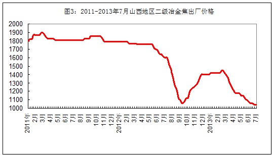 本周国内焦炭价格小幅下跌。截止本周五,山西地区二级冶金焦(A:13.5%)车板价格为1020元/吨左右(见图3),一级冶金焦(A:12.5%)车板价格保持1190元/吨,较上周末下跌20元,焦企面临较大限产压力;河北、辽宁地区一级冶金焦出厂价格下跌20元至1320-1340元/吨,钢厂采购谨慎,唐山部分钢厂焦炭库存较上周下降5%。山东地区二级冶金焦出厂价格保持1230元/吨左右,个别主导钢厂有压价意向。西南地区焦炭价格小幅下跌,贵州地区三级冶金焦出厂价格下跌20元至1450元/吨左右。本周煤炭市场稳中有跌,兖州煤业气煤出厂价格下调80元至830元/吨,徐州矿务局气煤出厂价格下调70元至990元/吨,平煤集团主焦煤出厂价格下调60元至1090元/吨。6月下旬国内钢材产量不减反增,焦炭市场需求相对稳定。不过,焦炭产能过剩、焦化企业限产力度不大仍是压制焦炭价格的主要原因。同时,近期煤炭市场持续疲软,也使得焦炭的价格重心不断下移。预计下周国内市场焦炭价格将稳中略降。