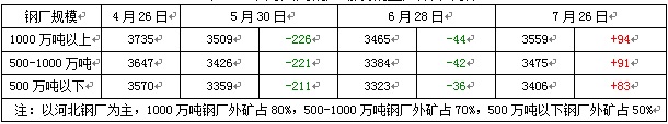 表2:7月份国内主要钢厂原料采购价格调整情况