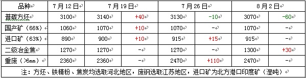 从库存情况看(见表3),随着7月底钢材价格回落,近期国内部分钢厂又放缓采购,希望延缓原料价格的涨势,但目前废钢、煤焦企业提价意向明显,部分钢厂到货量开始减少,库存略有下降。