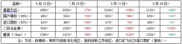 9月份国内原料市场走势分化,煤焦现货供应依旧紧张,价格继续大幅上涨,再创近2年新高;铁矿石、废钢、钢坯受钢价回落影响明显,价格多以小幅震荡下跌为主,下游用户多持观望态度,即使下旬后汽车运输成本提高,价格也上涨乏力。
