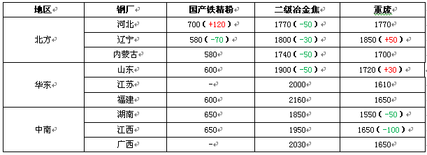 注:上表选择的均为该区域内最有代表性的钢厂价格