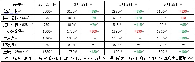 5月份国内钢材现货及矿煤焦钢期货价格整体上涨,但原料现货市场受到供应过剩、钢厂高炉检修等因素的综合影响,整体表现疲软,除钢坯价格追随成品材反弹外,其余原料品种均以下跌为主,其中焦炭价格跌势尤为明显,厂商信心明显不足。