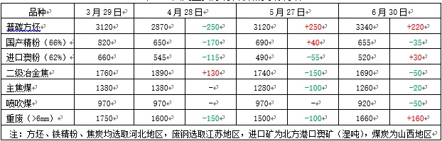 6月份国内原料市场总体是先抑后扬,与钢材联动性较强的钢坯和废钢中旬起便开始跟涨,钢坯价格更是创下今年的新高;铁矿石和焦炭资源压力较大,走势相对偏弱,直至下旬期货发力上涨后,现货价格才有小幅反弹。