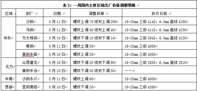 本周国内板材龙头企业宝钢、武钢出台6月份板材价格政策,对热轧出厂价格上调150元/吨,冷轧价格不变,显示板材企业订单情况依然不错,挺价信心较强。建筑钢材企业上半周在钢价下跌的局面下,价格以下调为主,下半周随着市场企稳回暖,对出厂价格进行上调的钢厂增多。其中华东地区主导钢厂沙钢对5月中旬螺纹出厂价格上调70元/吨,线材上调200元/吨,盘螺上调150元/吨。当前库存压力整体不大,订单情况较好,挺价信心依然充足。
